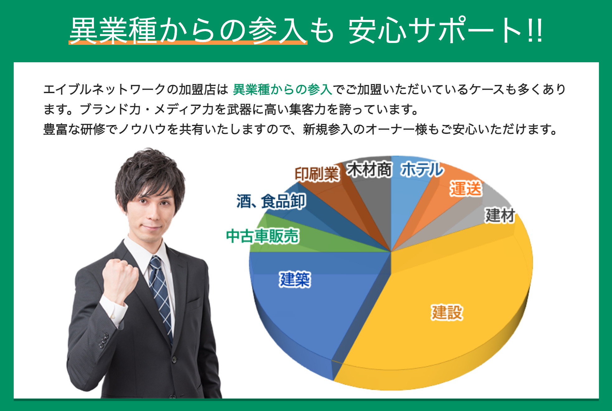 エイブルネットワークの加盟店は、建設・建築・中古車販売・酒、食品卸など異業種からの参入が多いのも特徴です。
