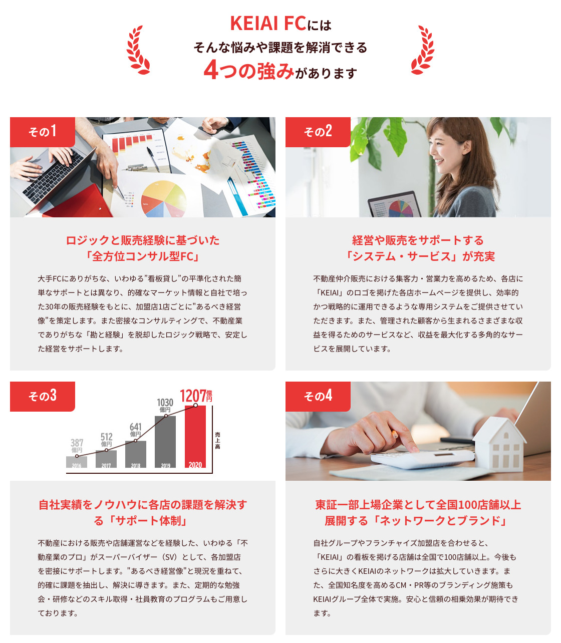 そんなケイアイのノウハウを、さらなる成長を目指す同業者様、新しく不動産業に挑戦される皆様と共有しようと生まれたのがこのKEIAI FCです。現場で培った営業ノウハウや人材育成術、新たな収益源や販路の拡大など、実務と実益を最大限に考慮したサービスを提供いたします。