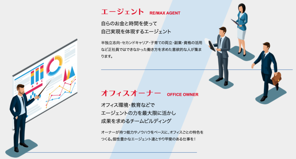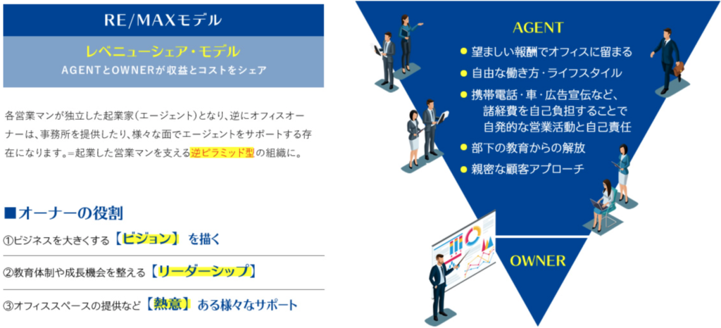 RE/MAXモデルは自立したエージェントをオフィスオーナーが支えるシェアリングビジネスのスタイルを採用しています。仕事を通じて自己実現を叶えたい〝エージェント〟は全国各地の【RE/MAXオフィス】に所属し、〝オフィスオーナー〟はその【RE/MAXオフィス】を運営し、環境整備やコーチングなどのサポートやチーム構築を行います。